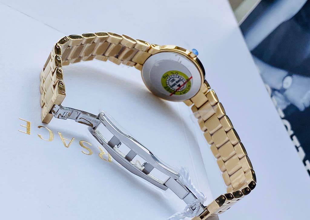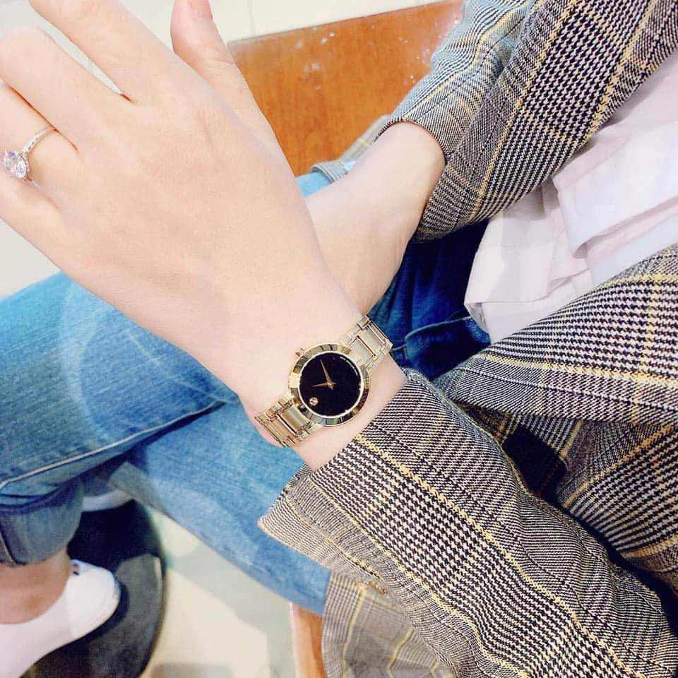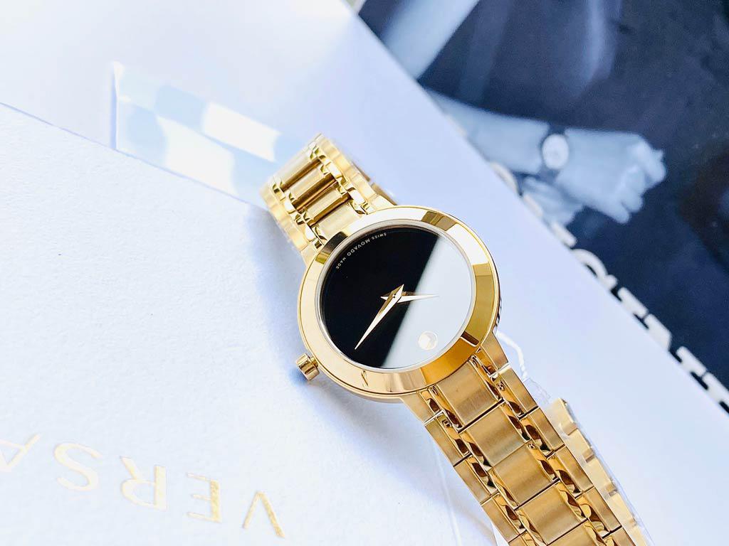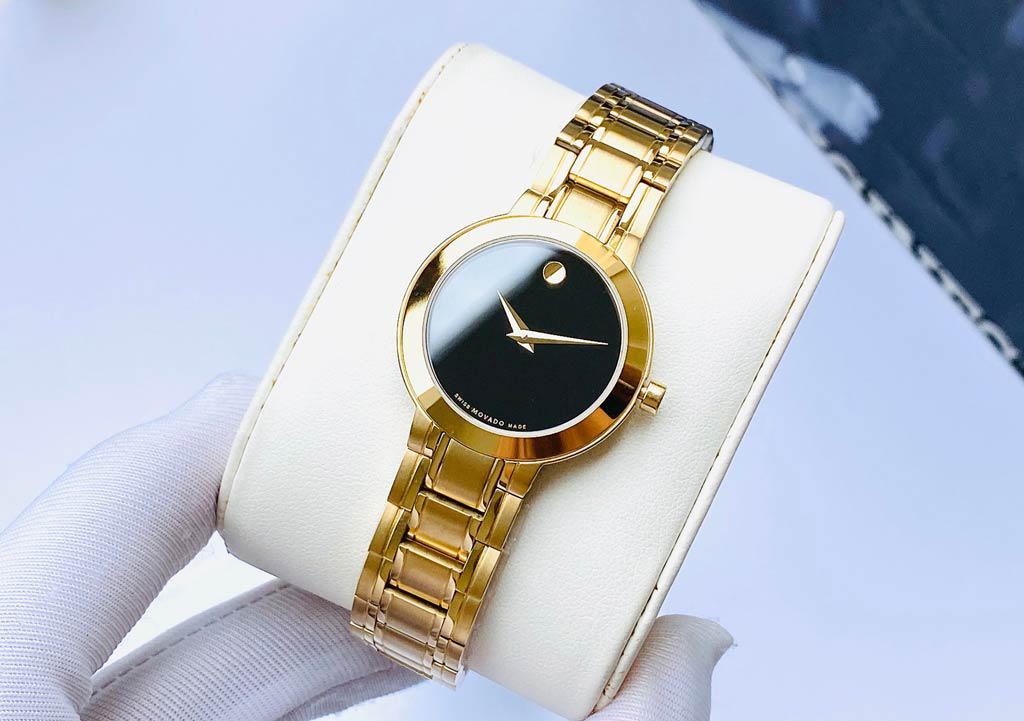 Mặt đồng hồ màu đen huyền bí được nổi nổi bật trên nền vàng sang trọng.