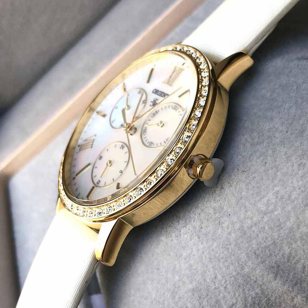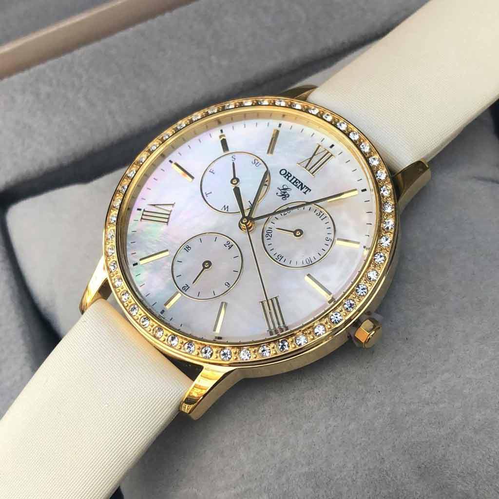 Thuộc dòng sản phẩm Orient , FUT0H004W0 là một trong những mẫu đồng hồ nữ đầy ấn tượng của thương hiệu đến từ xứ sở mặt trời mọc. Với ngoại hình nổi bật, cỗ máy của Orient có sức hút khó có thể chối từ. FUT0H004W0 sở hữu mặt số khảm trai đầy màu sắc với đường kính 37mm kết hợp hoàn hảo với dây da màu trắng trẻ trung. Bộ kim cùng cọc số dạng vạch được mạ vàng sang trọng đồng bộ với phần vỏ và núm. Vành bezel được đính đá bắt mắt khiến thiết kế của Orient thêm phần nữ tính. FUT0H004W0 được trang bị bộ máy điện tử Cal.H4A cùng 3 mặt số chức năng chỉ ngày, thứ và giờ 24h. Ngoài ra, mẫu đồng hồ này còn có kính cứng chịu lực cùng độ chịu nước 30m.