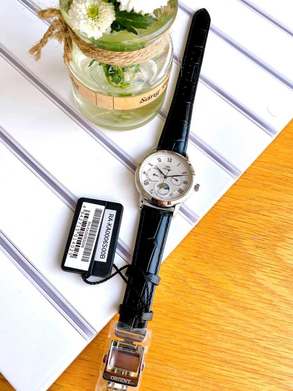 Orient RA-KA0006S10B thiết kế lịch trăng sao độc đáo thể hiện ngày đêm. Cọc số la mã chỉ giờ nổi bật trên nền vân trắng muốt sang trọng. Dây da cao cấp.