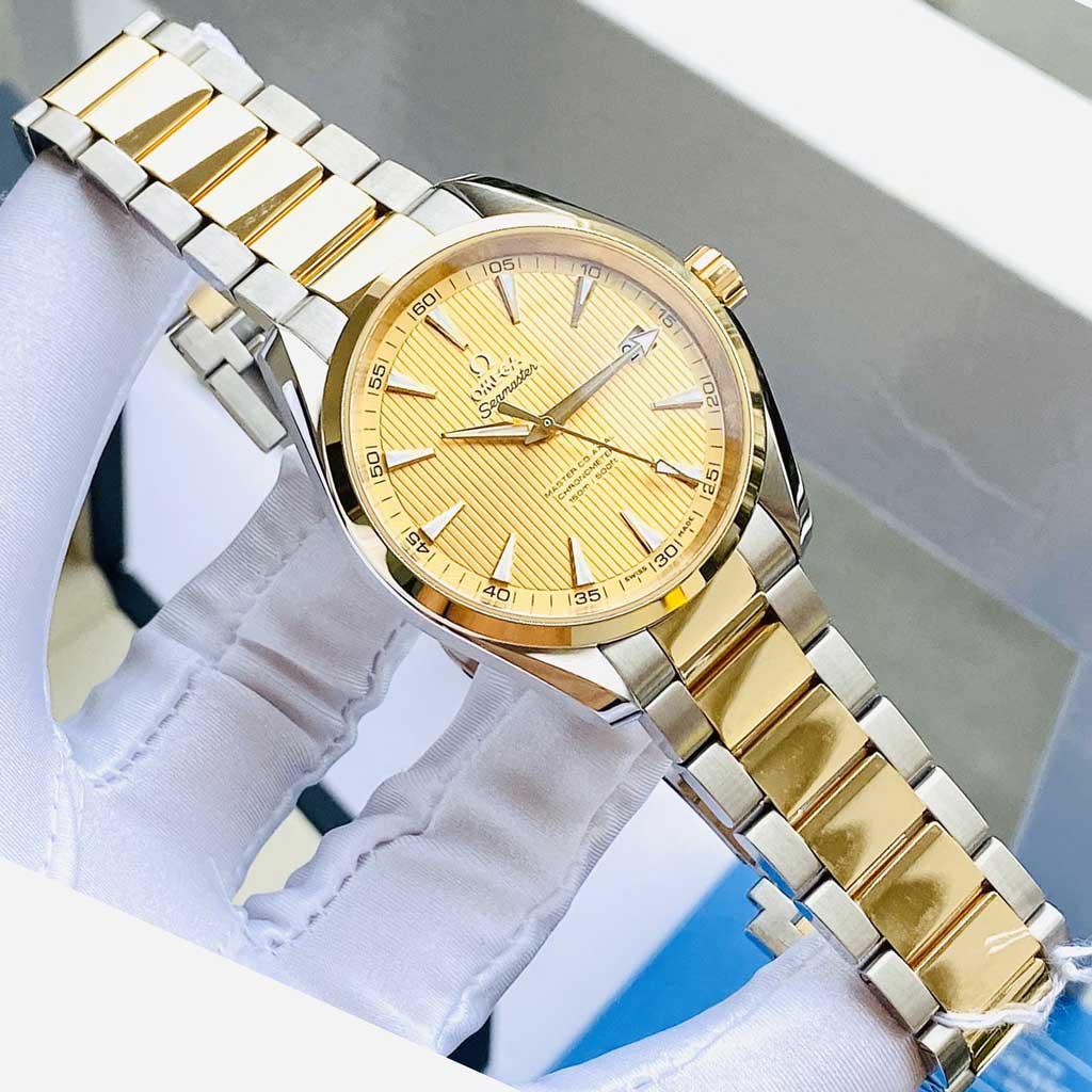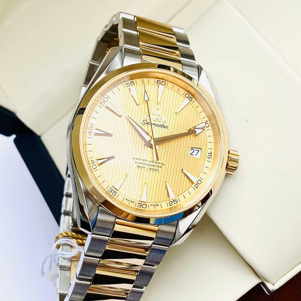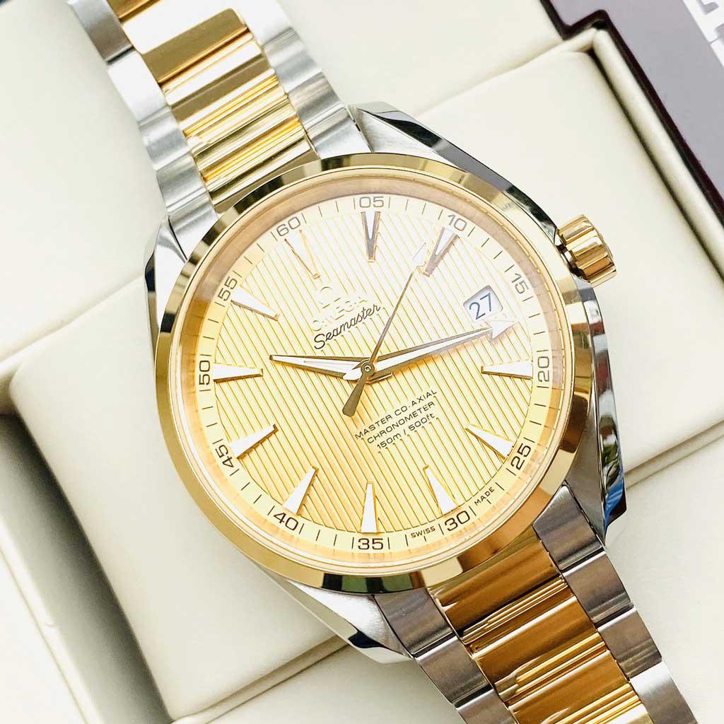 Omega Seamaster Aqua Terra - Size 41.5mm dễ đeo cực kỳ - Dày 13.2 mm - Niềng bezel vàng khối 18k, Kim cọc vàng khối - Dây vàng đúc 18k rất dầy. - Máy Omega 8500 inhouse với 39 chân kính, 60h tích cót & 25200vph. Chống nhiễm từ 15000 gauss, - Chống nước 150m, dạ quang sáng - Kính sapphire chống lóa 2 mặt, rất đẹp Hàng mới 100%,full set.Bảo hành toàn cầu.