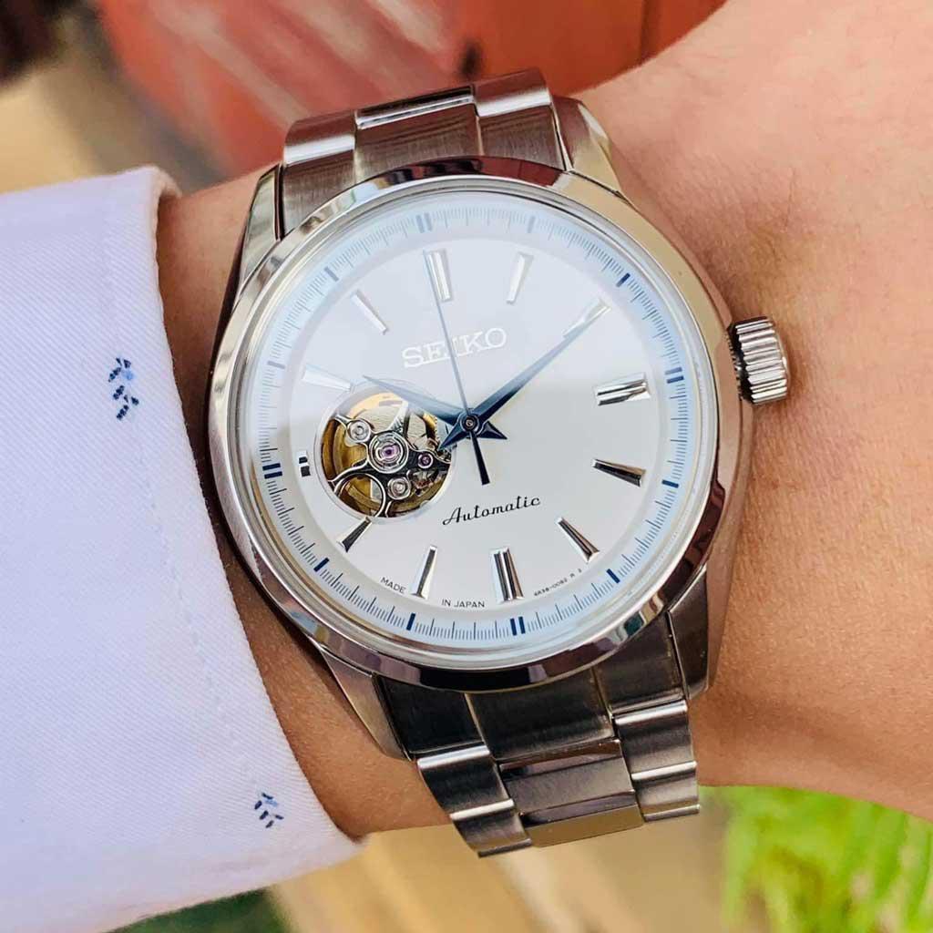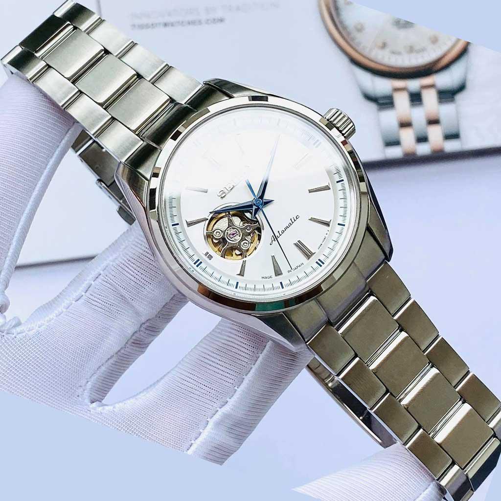 - Mặt trắng kim xanh kinh điển, thiết kế hở tim (Open heart) khoe bộ máy bên trong, em nó thật tinh tế và có độ hoàn thiện cao.