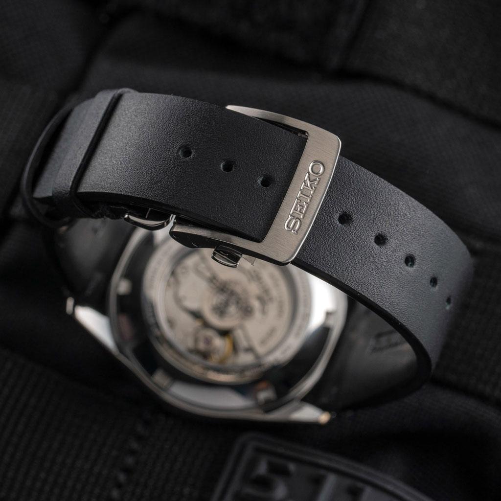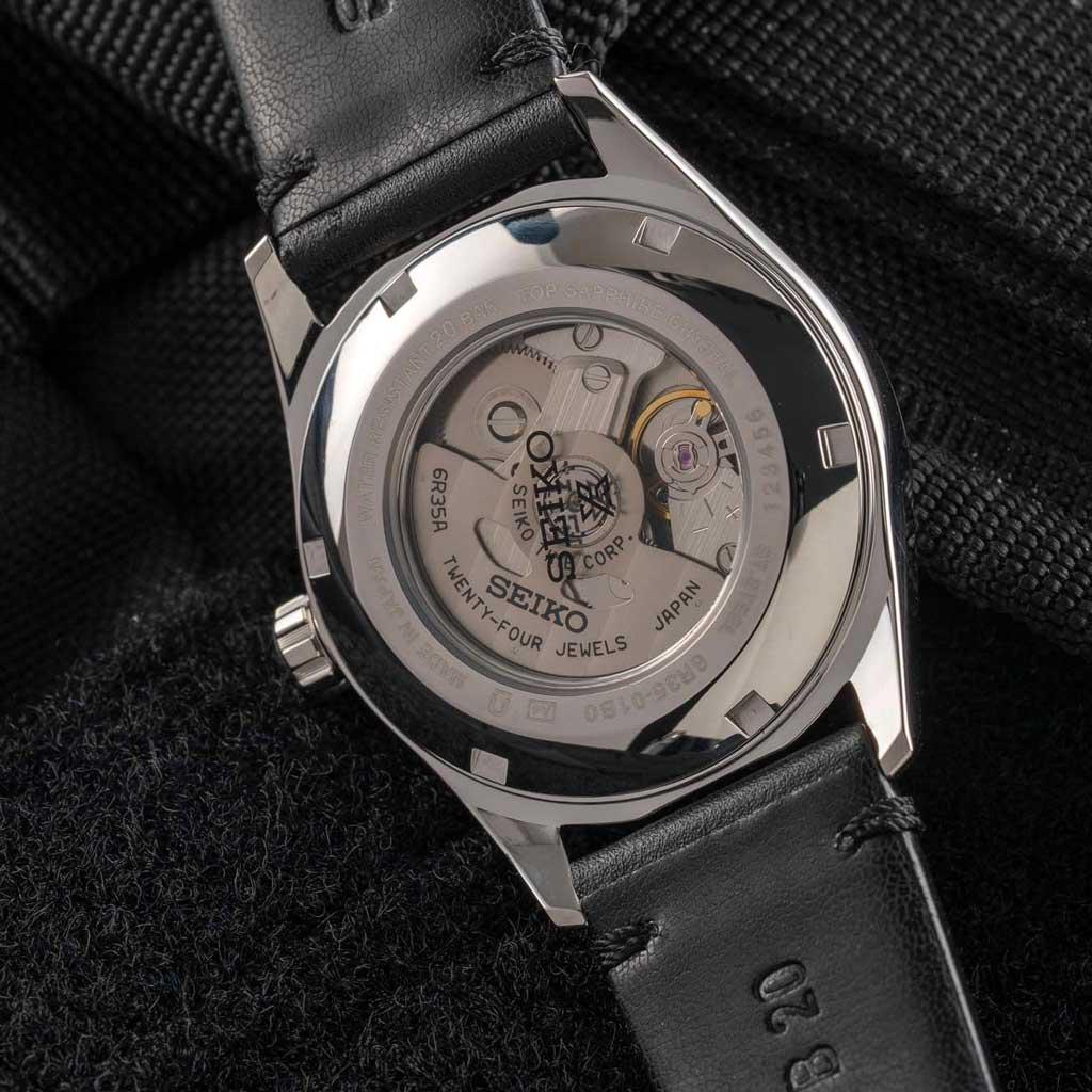 Từ bộ sưu tập Prospex, chiếc đồng hồ này đã được chế tác bằng vỏ thép không gỉ hình tròn, cứng với mặt đồng hồ màu đen có kết cấu với kim Lumbrite, chỉ số và dây đeo bằng da bê màu đen bổ sung. Cũng như màn hình hiển thị ngày được bảo vệ bằng kính Sapphire Crystal cong bền, có lợi từ lớp phủ chống phản chiếu trên bề mặt bên trong. Đồng hồ này được cung cấp năng lượng bởi bộ máy tự động 6R35 Calibre có thể được xem qua một chiếc vỏ xuyên thấu ở mặt sau