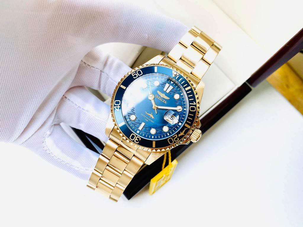 Invicta Pro Diver Mens Quartz 30024 Vỏ và vòng tay bằng thép không gỉ tông vàng vàng. Vòng bezel tông màu vàng vàng xoay một chiều với vòng màu xanh lam. Mặt số màu xanh lam với kim đồng hồ màu vàng sáng và các vạch chỉ giờ. Điểm đánh dấu phút xung quanh vành ngoài. Loại quay số: Analog. Bàn tay và điểm đánh dấu phát quang. Hiển thị ngày ở vị trí 3 giờ. Bộ chuyển động thạch anh PC32 cỡ Hattori. Tinh thể nhiệt hạch chống trầy xước. Kéo / đẩy vương miện. Ốp lưng chắc chắn. Hình dạng hộp tròn. Kích thước vỏ: 43 mm. Độ dày vỏ: 12 mm. Chiều rộng băng: 22 mm. Chiều dài dây: 7,25 inch. Gấp lại clasp. Chống nước ở 100 mét / 330 feet. Chức năng: ngày, giờ, phút, giây. Phong cách đồng hồ thông thường. Nhãn đồng hồ: Japan Movt. Invicta Pro Diver Quartz Blue Dial Yellow Gold-tone Mens Watch 30024.