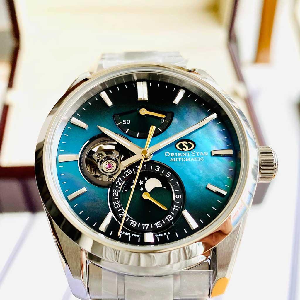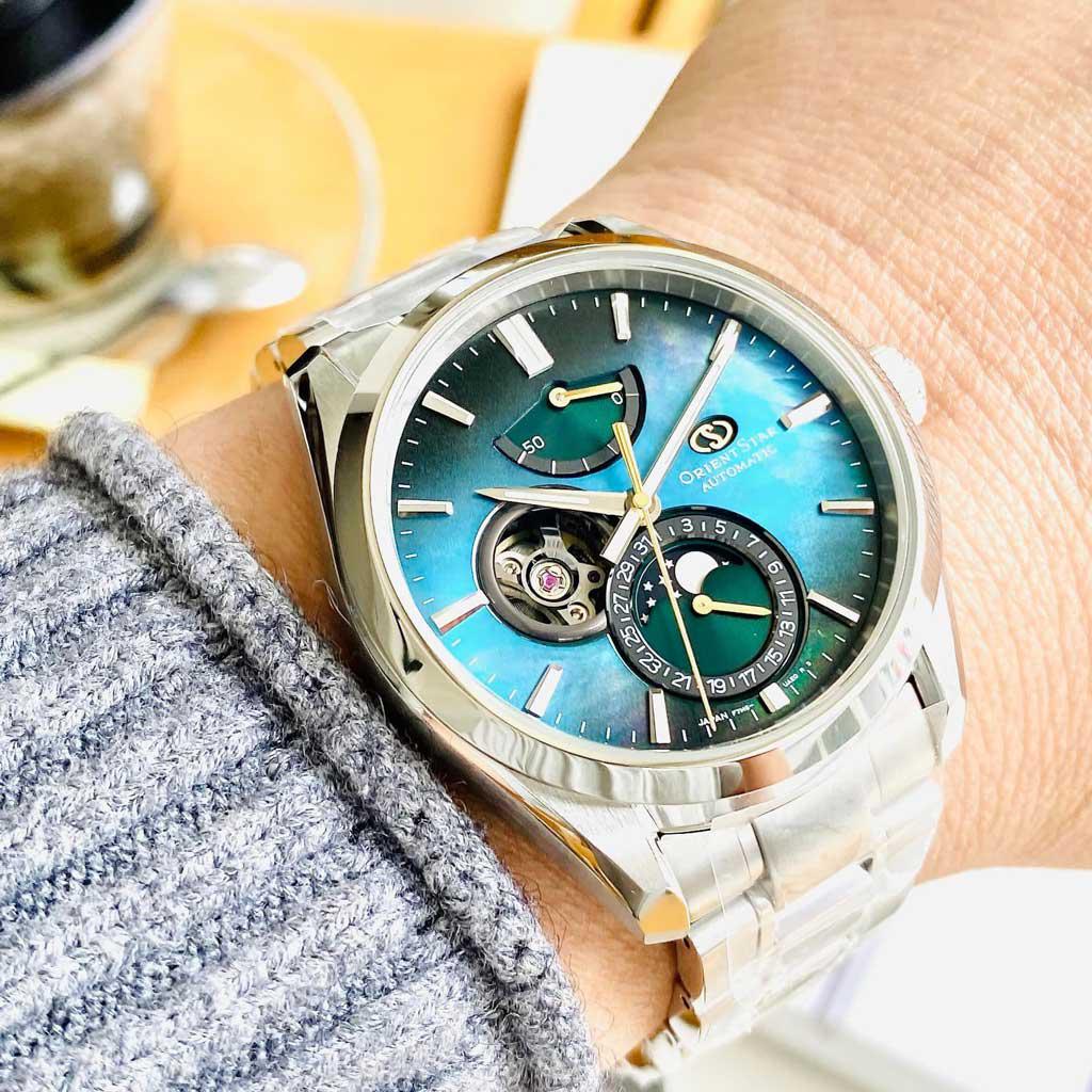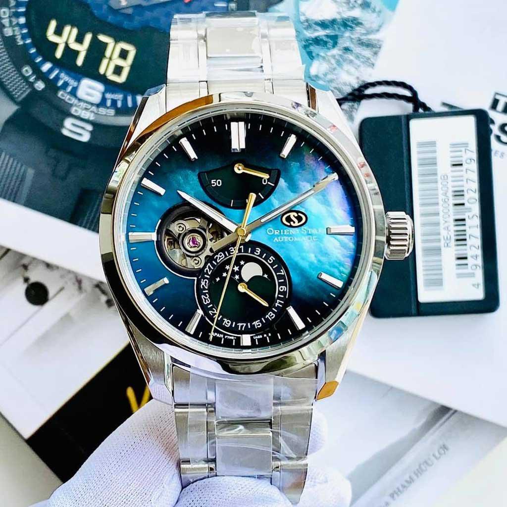Lại một siêu phẩm moon phase đến từ nhà Orient Star , Orient Star RE-AY0006A00B có đường kính 41 mm và độ dày 13.1 mm. Mặt kính được làm bằng chất liệu kính sapphire.